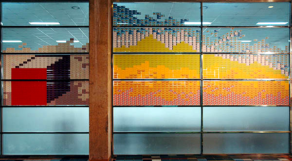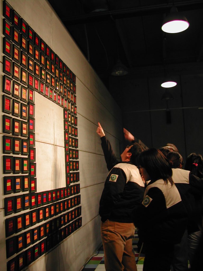 Responding to this, I created a series of installation works with an intriguing question – why are blue collar workers never given a business card? I worked closely with six female workers in one rural food factory and created individually designed name cards for them, based on their life stories. At the same time, I collected all the identically designed corporate business cards of those who worked in the headquarter office of the same company. All together in juxtaposition, thousands of name cards were installed in a pixelated landscape on the outside wall of the factory canteen (nameless landscape, 2007). I also individually embroidered and framed the names of all workers in the factory and installed them into a shape of an empty frame (everyone’s souvenir, 2007), implying that the unique identity of manufacturing workers is not socially recognised.